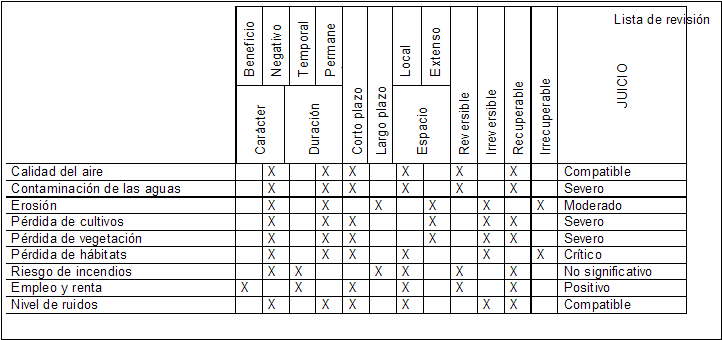 Identificación de impactos: Una vez determinadas acciones y factores son muchas las metodologías que pueden ayudar a identificar los impactos antes de empezar a valorarlos. La lista de revisión es la forma más elemental. Consiste en realizar una lista donde se enumeran posibles impactos, (o acciones, factores ambientales, indicadores...). A la vista de ella se deducen cuáles de esos impactos son los que se producen con la obra que se estudia y se analizan si son simples efectos mínimos o efectos notables que se denominan impactos significativos. Ejemplo de lista de revisión: Ejemplo de lista de revisión en forma de matriz en la construcción de una autovía: |