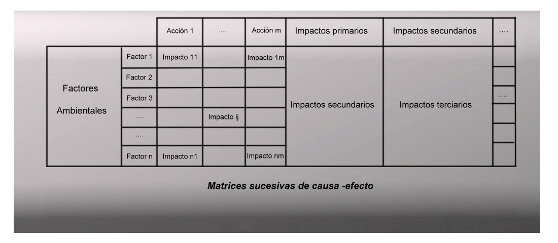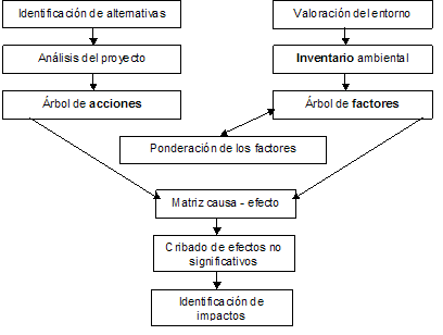 Árbol de acciones: La metodología a seguir se basa en dos pilares, el conocimiento del proyecto para obtener las acciones y el estudio del entorno para obtener los factores. Por lo tanto una tarea es la de describir el proyecto y las posibles alternativas, y realizar una lista con las acciones derivadas del proyecto. Ejemplo de lista de acciones: Por ejemplo, para el caso de una carretera, estas acciones pueden ser: 1.FASE DE PLANEAMIENTO 1.1. Diseño y localización de alternativas 2. FASE DE CONSTRUCCIÓN 2.1. Ocupación del terreno 2.2. Explanación y desvío de servicios 2.2.1. Desbroce y despeje 2.2.2. Movimientos de tierra: desmonte y terraplenes 2.2.3. Uso de explosivos 2.2.4. Préstamos, canteras y vertederos previstos 2.2.5. Explotación de canteras 2.2.6. Desvíos y reposiciones 2.3. Afirmado 2.4. Estructuras 2.4.1. Construcción de puentes 2.4.2. Obras de drenaje 2.5. Obras y trabajos auxiliares 2.5.1. Instalaciones 2.5.2. Circulación de maquinaria 2.5.3. Actividades auxiliares 3. FASE DE EXPLOTACIÓN 3.1. Circulación de vehículos 3.2. Presencia física y funcionamiento de la vía 3.3. Mantenimiento 3.4. Áreas de servicio Inventario ambiental: La valoración del entorno se realiza mediante el inventario. Su objetivo es obtener un listado de los factores ambientales y su ponderación. Por ejemplo, el esquema a seguir puede ser:
