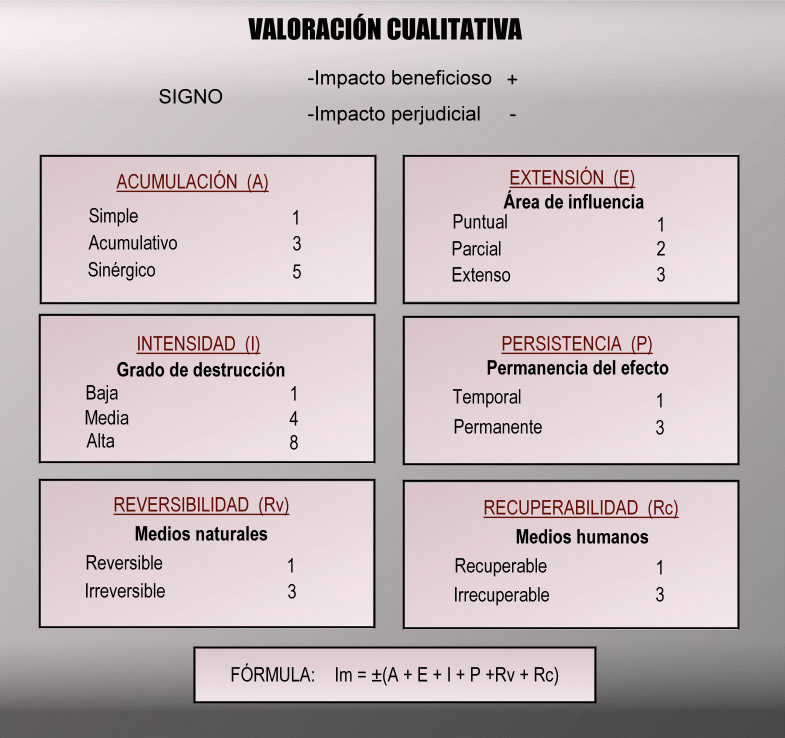 VALORACIÓN CUALITATIVA O CÁLCULO DE LA IMPORTANCIA Toda valoración, por definición, es subjetiva, lo cual no significa que tenga que ser arbitraria. Las distintas técnicas de valoración de impactos intentan disminuir la posible subjetividad de las conclusiones justificando de la mejor manera posible todos los juicios de valor que se realizan. En las técnicas de valoración cualitativa se valoran, de forma subjetiva, aunque el resultado obtenido sea numérico, una serie de cualidades de cada uno de los impactos de cada una de las alternativas, asignando valores prefijados según esa cualidad sea alta, media o baja. Los valores obtenidos pueden reflejarse de nuevo en una matriz de cruces entre acciones y factores, que algunos autores denominan matriz de importancia y otros, índices de incidencia. La razón para llamar así a esta valoración cualitativa es que refleja, de alguna manera la importancia (Im) del impacto, midiendo la trascendencia de la acción sobre el factor alterado mediante determinados atributos. Sobre la valoración cualitativa de nuevo la legislación ayuda a definir las cualidades que deben tenerse en cuenta. Los atributos reflejados en la legislación son: “Los distintos aspectos ambientales (efectos directos e indirectos; simples, acumulativos o sinérgicos; a corto, a medio o a largo plazo; positivos o negativos; permanentes o temporales; reversibles o irreversibles; recuperables o irrecuperables; periódicos o de aparición irregular; continuos o discontinuos)” (ANEXO 1: Conceptos técnicos Real Decreto 1131/1988, de 30 de septiembre). Descripción Cualitativa: Para realizar un análisis cualitativo se tienen en cuenta las siguientes características